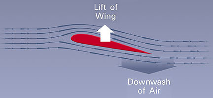 According to this explanation, the slight downward deflection of the air leaving the trailing edge of a wing is what produces lift. Since for every action there is an equal and opposite reaction, the downward push on the air must result in an upward push on the wing.