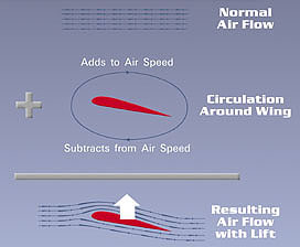 This is the oldest and most complex theory of lift. It explains how the difference in air speed over and under the wing results from a net "circulation" of air. Above the wing, the circulatory flow adds to the overall speed of the air; below the wing, it subtracts. But the actual force on the wing results from the difference in air pressure caused by the difference in airflow speeds.